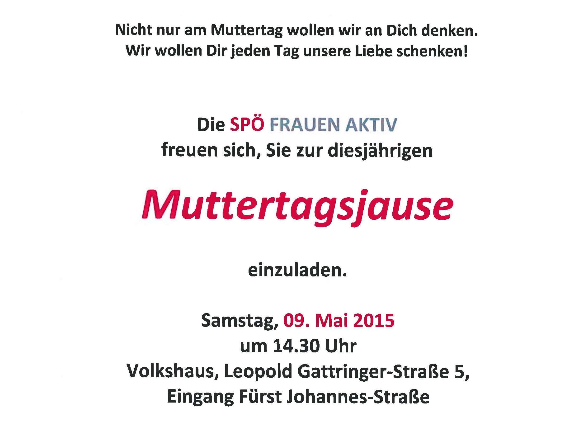Die diesjährige Muttertagsjause findet wieder im Volkshaus statt - Lassen Sie sich von uns verwöhnen und genießen Sie einen unbeschwerten Samstagnachmittag.Samstag, 9.Mai 2015, 14.30 Uhrim VolkshausLeopold Gattringerstraße 5 (Eingang Fürst Johannesstraße).Wir bitte um Anmeldung bei:gf.GR Gaby…
